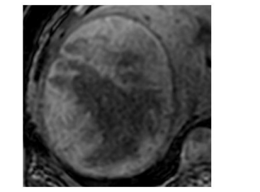 | Figure 16: Axial hepatobiliary phase shows the mass as isointense to the adjacent liver parenchyma with areas of central hypointensities |