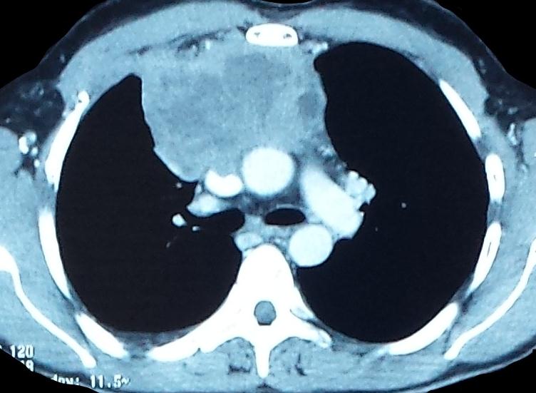 Figure 2: Chest CT scan showing a right antero-posterior mediastinal mass, tissue, heterogeneous, contact with the Mediastinal vascular structures, without obvious wall extension |