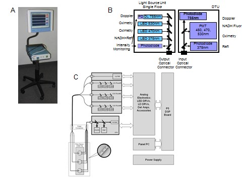 1. Light Source Unit – provides UV light at 365 nm for NADH fluorescence excitation and tissue reflection measurements. Also