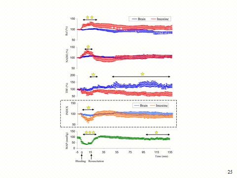 The Effect of Hemorrhagic Shock:The same approach developed for the calculation of the TMS was tested in one of our experimental protocols. The technology and animal preparation details were published elsewhere [48]. In the specific protocol shown in Figure 24, the rat was exposed to 60 minutes of controlled hypotension. Under controlled 40 mmHg hypotension maintained for 60 minutes, only 7 rats out of 13 survived. Figure 24 shows the averaged responses of those rats. The hypotension was induced by bleeding out 45±4% of the rats' total blood volume. During bleeding, MAP sharply decreased by 51±0.5 mmHg (p< 0.001). Both TBF's decreased rapidly and stabilized at low levels. However, while IBF significantly decreased by 61±6% (p< 0.001) CBF significantly decreased only by 45±5.5% (p< 0.01). Intestinal reflectance showed a trend of increase, while the cerebral reflectance increased by 5±2% (p< 0.05) and decreased back to its basal level. In comparison to the intestinal NADH, which slowly increased up to 228±24% (p< 0.01), cerebral NADH increased only to a level of 142±5% (p< 0.01). The maximum levels of NADH in both organs were monitored at the end of the hemorrhagic period and were also associated with the maximum changes in TBF.
