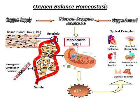 | Figure 4: Schematic presentation of tissue oxygen balance evaluated by energy supply and demand. Energy supply could be measured by monitoring tissue blood flow (TBF), tissue blood volume (TBV) and hemoglobin oxygenation (HbO2) which is similar in all tissues. Energy demand varies between the different tissues and may include Ionic Homeostasis and Signal Conduction (brain), Muscle contraction (heart), Glandular Secretion, G-I tract and kidney function. Mitochondrial NADH redox state serves as an indicator for tissue oxygen balance. |