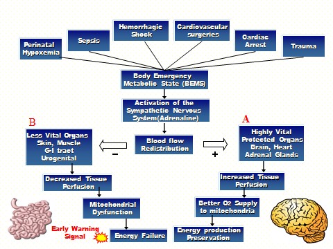 The pattern of pathophysiological cascade of events that may occur in many emergency clinical situations in adult patients and may lead to morbidity and mortality is shown in Figure 8. As shown, various pathological states may lead to metabolic disturbances and may result in cellular energy derangement [23-26]. The six pathological states, shown in the upper part of Figure 8, are the most common events that may develop in clinical practice. They may develop due to a specific salient event, such as a major operation or during a slow process of body deterioration, e.g. in sepsis or shock. The definitions of each of those 6 states are not so well established and some overlapping may exist. Under all those situations, the metabolic state of the body will be deteriorated and energy failure will develop. The situations shown in Figure 8 could develop in patients hospitalized in various operating rooms or intensive care units, as well as in emergency rooms. These include the respiratory, neurosurgical, cardiac and neonatal ICU. Also, all patients undergoing severe operations, such as cardiac bypass, neurosurgical or organ transplantation, may develop the Body Emergency Metabolic State - BEMS. Other patients that may develop BEMS are newborns during delivery or elderly patients treated in the internal medicine departments. As a central protection mechanism, blood flow redistribution will occur and the three protected organs (A - brain, heart and adrenal gland) will receive more blood and O2, while the peripheral organs or areas (B - skin, G-I tract, Urogenital and muscles), as well as others less vital visceral organs, will undergo vasoconstriction and a decrease in blood flow and O2 supply. Monitoring the cellular function is the most significant indicator of the metabolic state of patients in critical care medicine [27,28]. The energy balance in the most vital organs will remain positive due to higher blood flow, while the less vital organs will be hypo-perfused and a negative energy balance will develop. As presented in Figure 8, the blood flow redistribution mechanism will affect the energy production by the mitochondria in the most vital and less vital organs in the body. This change in mitochondrial function will affect the production of ATP.