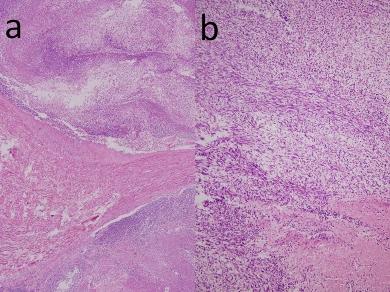 | Figure 2: Microscopic pictures of tumors in the heart and lung (a) Spindle cells with prominent necrosis infiltrates in the myocardium, magnification rate: 40X (b) Prominent nuclear atypia, magnification rate: 100X |