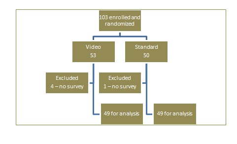 Of the 103 patients that were enrolled in our study, 53 patients were assigned to the Video group and 50 patients were assigned to the Verbal handoff group. There was no statistical difference of in age when comparing the 2 groups. Average age in months of participants were 8.5 in video group and 11.2 in verbal only group: p=0.560. Of the various demographics, only gender approached clinical significance with a p-value of 0.057 (CI: -5.4681 to 0.0820) [Table 1].