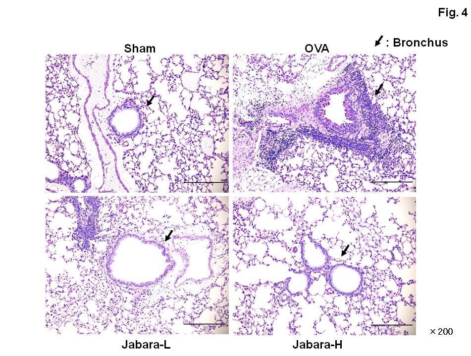 Methods:Mice were sensitized and challenged with ovalbumin to induce chronic airway inflammation. Two groups were orally administered citrus jabara juice at a daily dose of 10 mg/ml or 100 mg/ml in sterile water from day -3 to day 28.